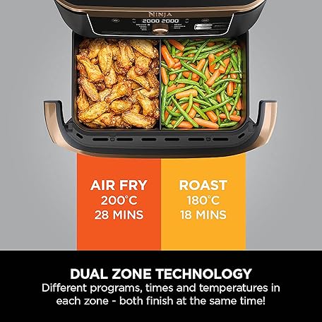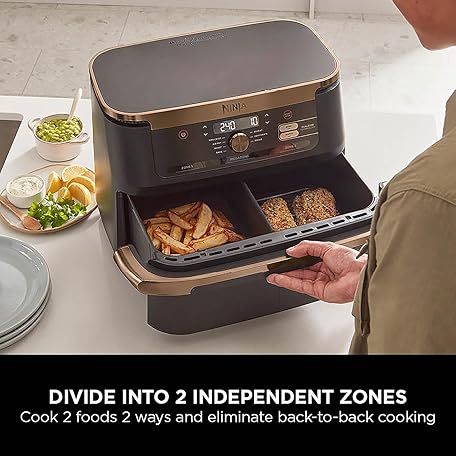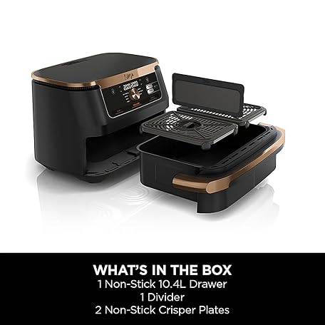 Thông tin sản phẩm Ninja Foodi FlexDrawer Air Fryer, Dual Zone with Removable Divider, Large 10.4L Drawer, 7-in-1, Air-Fryer, Air Fry, Roast, Bake, Crisp, Non-Stick Dishwasher Safe Parts, Black and Copper, AF500UKCP