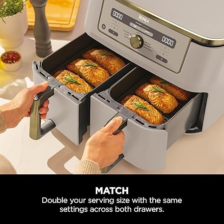 Thông tin sản phẩm Ninja MAX Dual Zone Digital Air Fryer, 2 Drawers, 9.5L, 6-in-1, Uses No Oil, Air Fry, Max Crisp, Roast, Bake, Reheat, Dehydrate, Non-Stick, Dishwasher Safe Baskets, Stone Gold DZ400UKSTGD