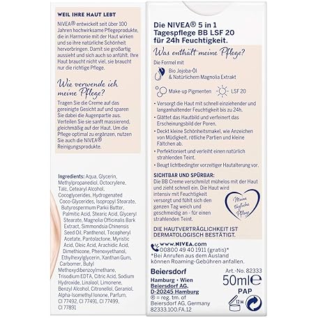 Thông tin sản phẩm NIVEA BB 5 in 1 Day Cream 24h Moisture (50 ml), BB Cream for Light Skin Types with SPF 20, Tinted Day Cream with Organic Jojoba Oil & Makeup Pigments