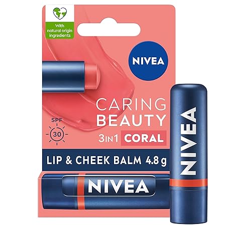 NIVEA Caring Beauty Coral Lip Balm SPF30 (4.8g), 3-in-1 Buttery Lip and Cheek Tint, Rich Colour and 24H Moisturisation with SPF 30 Protection