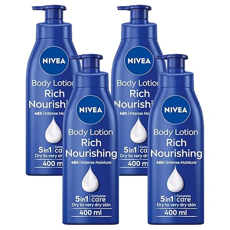 NIVEA Rich Nourishing Body Lotion (400ml), NIVEA Moisturiser for Dry Skin Made with Deep Moisture Serum, Natural Almond Oil, and Vitamin E, Smooth Skin NIVEA Body Lotion (Pack of 4)