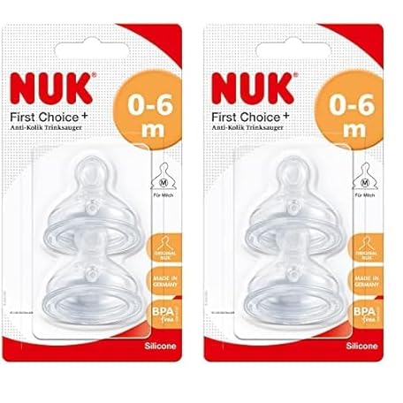 NUK First Choice+ Baby Bottle Teat, 0-6 Months, Silicone with Medium Feed Hole, Anti-Colic, 2 Count (Pack of 2)