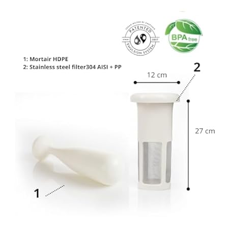 Thông tin sản phẩm Nut Milk Maker Basic, 2-piece, emulsifying filter for soups, sauces, vinaigrettes, plant-based milk, specialty coffee creations, cocktails, etc. 0.5L to 5L in 1 minute. QR code with recipes.