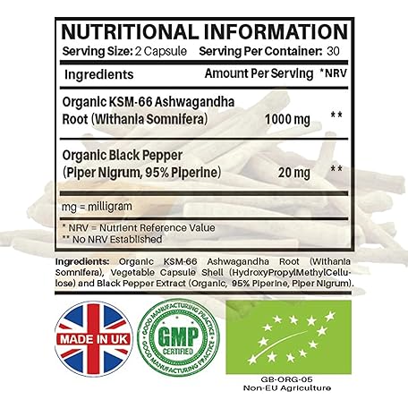 Thông tin sản phẩm Nutrabytes Organic Ashwagandha 1000mg Premium KSM-66 Supplement, 60 Vegan Capsules | High Strength with 5% Withanolides & Black Pepper | Supports Cognitive Function, Energy & Calm | 1 Month Supply