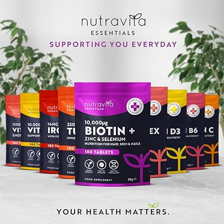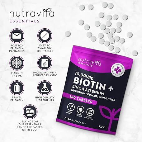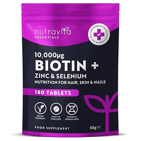 Sản phẩm Nutravita Biotin Hair Growth Supplement 10,000mcg - Scientifically Proven to Maintain Normal Hair Skin & Nails - 180 High Strength Vegan Tablets with Zinc & Selenium - Biotin Vitamins for Women & Men đang được bán với giá ưu đãi là $11.3469 tại nước Anh.