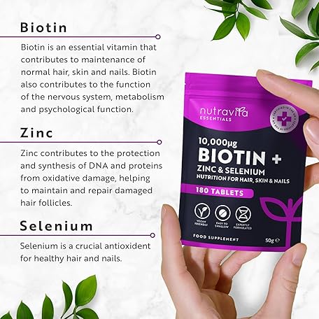 Thông tin sản phẩm Nutravita Biotin Hair Growth Supplement 10,000mcg - Scientifically Proven to Maintain Normal Hair Skin & Nails - 180 High Strength Vegan Tablets with Zinc & Selenium - Biotin Vitamins for Women & Men
