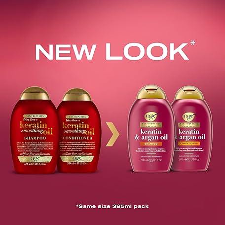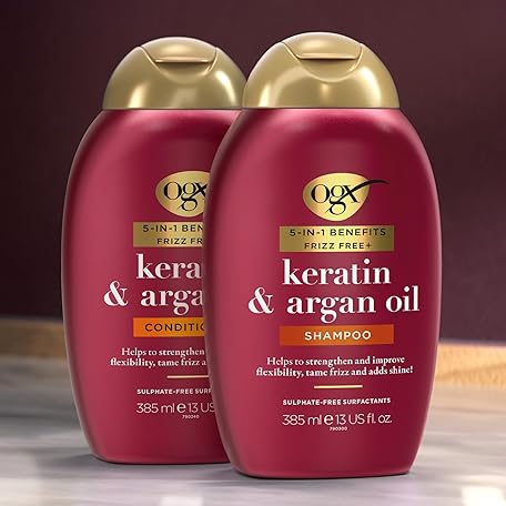 Thông tin sản phẩm OGX 5in1 Benefits Frizz Free with Keratin & Argan Oil Shampoo, Strengthens and Improves Flexibility, Tames Frizz and Adds Shine, Sulfate Free, 385ml