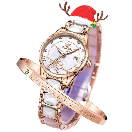 • OLEVS Ladies Watch Rose Gold Ceramic Designer Elegant Note Fashion Luxury 3ATM Date Waterproof Luminous Green Valentine's Day Present Quartz, White Dial, Fashion Dress