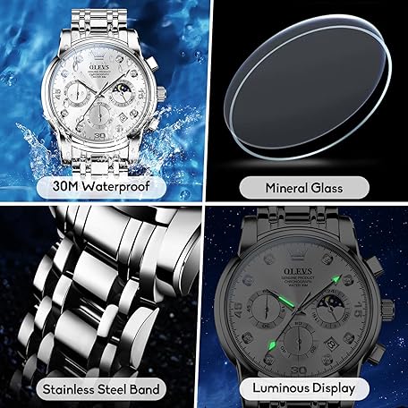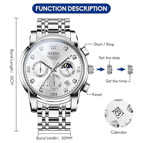 Thông tin sản phẩm OLEVS Men's Chronograph Watch, Gold Silver Stainless Steel Analog Quartz Watch, Waterproof Multi-Function Dial with Date Diamond Watches for Men