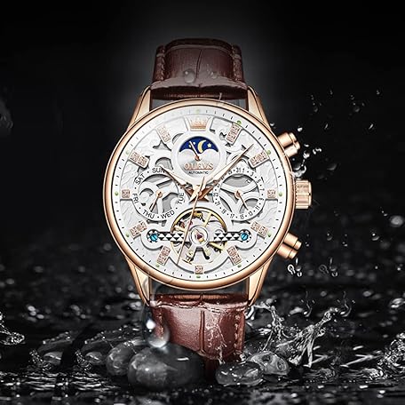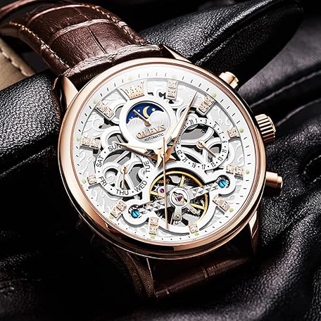 OLEVS Men's Watch Leather Skeleton Automatic Mechanical Tourbillon Calendar Moon Phase Luminous Waterproof Luxury Business Wristwatch, Z:White Dial&Brown Leather, Modern