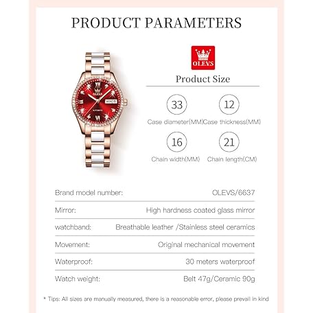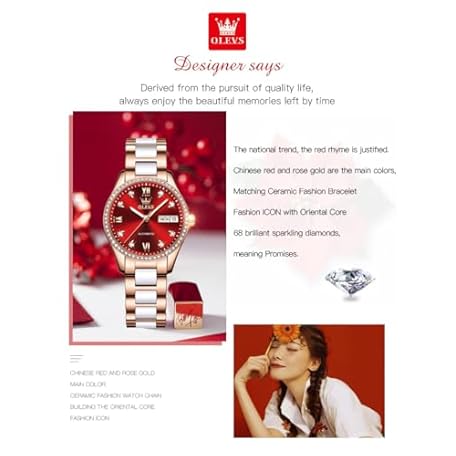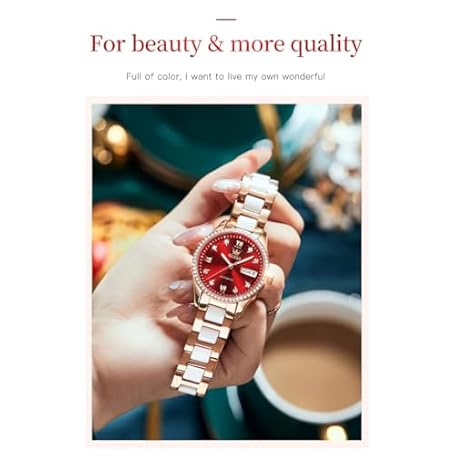 Thông tin sản phẩm OLEVS Rose Gold Women's Watches, Ceramic Stainless Steel Band, Automatic Mechanical Watch, Waterproof Luminous Pointer Calendar, Diamonds Elegant Watches for Women, Red/Blue/White Dial [No Battery]