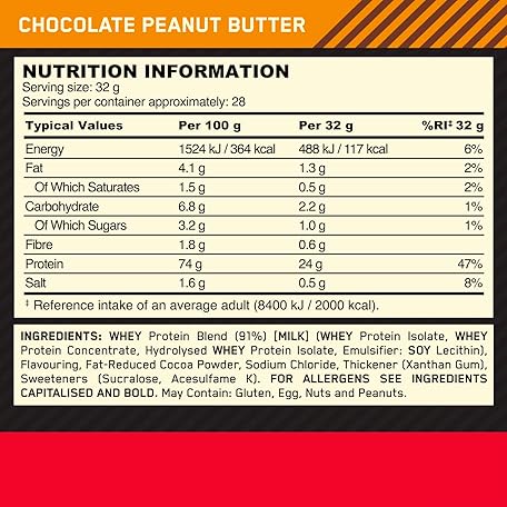 Thông tin sản phẩm Optimum Nutrition Gold Standard 100% Whey Protein, Muscle Building Powder With Naturally Occurring Glutamine and BCAA Amino Acids, Chocolate Peanut Butter Flavour, 28 Servings, 896 g