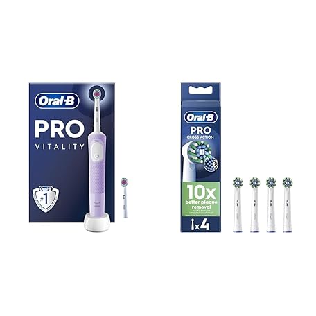 Oral-B Vitality Pro Electric Toothbrush, 1 Handle, 2 Toothbrush Heads, 3 Brushing Modes, 2 Pin UK Plug, Purple + 4 Oral-B Pro Cross Action Electric Toothbrush Heads