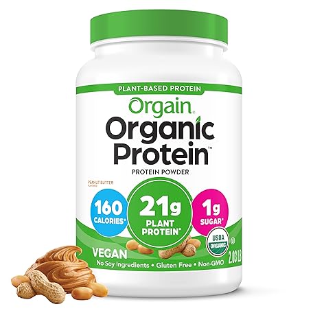 Orgain Organic Vegan Protein Powder, Peanut Butter - 21g Plant Protein, 7g Prebiotic Fiber, Low Net Carb, No Dairy Ingredients, No Added Sugar, for Shakes & Smoothies, 2.03 lb (Packaging May Vary)
