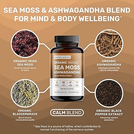 Thông tin sản phẩm Organic Irish Sea Moss & Ashwagandha Capsules - Calm Blend - 60 Capsules - Ashwagandha High Strength 1200mg w/Black Pepper - Immunity & Stress Support - Vegan, Non-GMO, UK Made, Certified Organic