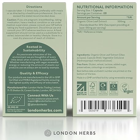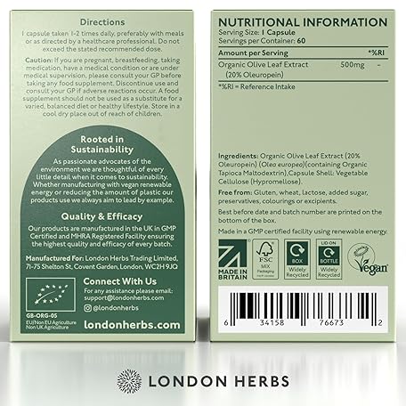 Thương hiệu London Herbs là cái tên nổi tiếng được rất nhiều khách hàng trên thế giới chọn lựa. Với kiểu dáng đẹp mắt, sang trọng, sản phẩm Organic Olive Leaf Extract 500mg | Standardised for 20% Oleuropein | 60 Vegan Capsules | Made in The UK là sự lựa chọn hoàn hảo nếu bạn đang tìm mua một món cho riêng mình.