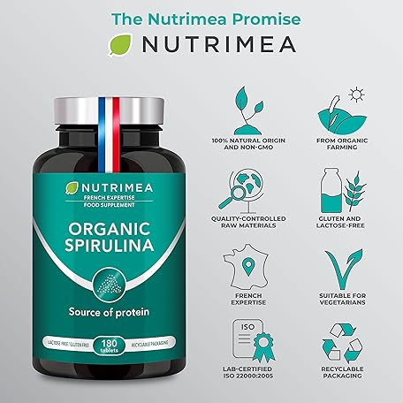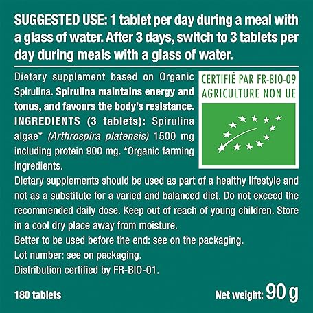 Thông tin sản phẩm Organic Spirulina Tablets (200 x 500mg) - Rich in Protein, Vitamins, Antioxidants, Iron, Low Calories - 19% of Phycocyanin - Strengthens Hair and Nails - French Expertise