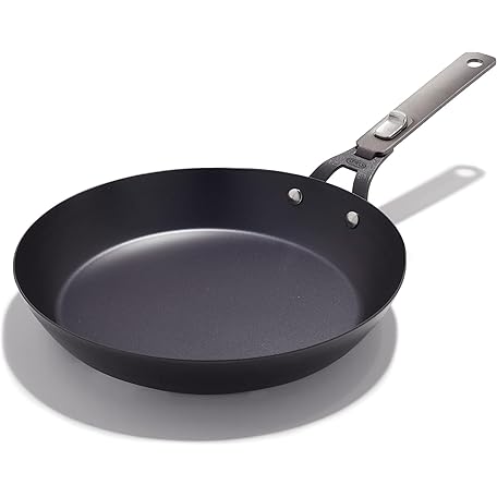 OXO Outdoor Pre-Seasoned Carbon Steel 12" Frying Pan Skillet, Detachable Handle for Easy Storage, Indoor Use, Nonstick with Use, Induction Suitable,Oven & Broiler Safe,Browning, Grill,Sear,Saute,Black