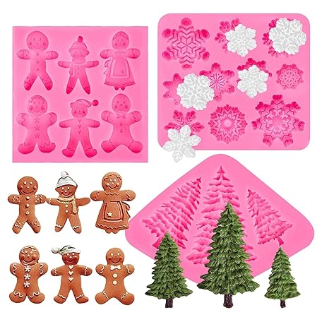 Pack of 3 Christmas Silicone Moulds - Snowflake, Christmas Tree & Gingerbread Man Fondant Moulds, Non-Stick Chocolate Moulds for Baking, Christmas & Winter Decoration for Cakes & Cupcakes
