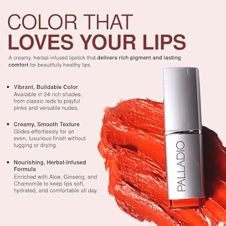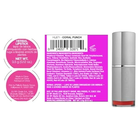 Thông tin sản phẩm Palladio Herbal Lipstick, Rich Pigmented and Creamy Lipstick, Infused with Aloe Vera, Chamomile & Ginseng, Prevents Lips from Drying, Combats Fine Lines, Long Lasting, Coral Punch