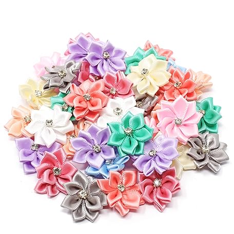 Pastels Mix 25mm Satin Ribbon Flowers with Rhinestone Diamante Centre, Craft Flowers (50)