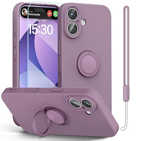 pcgaga Silicone Phone Case for iPhone 17 6.3 Inch with Screen Protector [Ring Holder Stand] [Wrist Strap] [Microfiber Lining] Slim Shockproof Protective Cover, 6.3", Purple