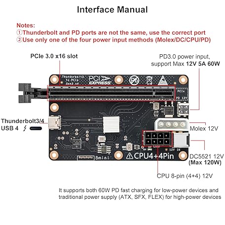 Thông tin sản phẩm PCIE 3.0 x16 22Gbps eGPU DOCK, Thunderbolt 4 cable, compatible with external GPU Intel AMD Graphics Card for Windows Laptop Console featuring Thunderbolt 3/4 USB 4, Powered by PD/8Pin CPU/Molex/DC5521