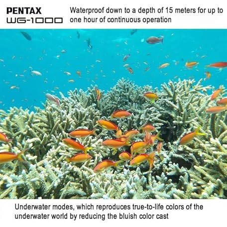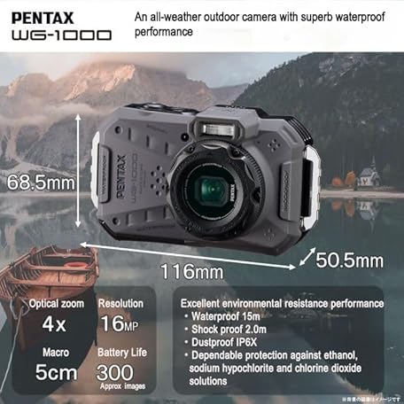 Thông tin sản phẩm Pentax WG-1000 (Grey) waterproof digital compact camera, designed for casual outdoor and underwater photography, waterproof to a depth of 15 meters, for up to one hour of continuous operation