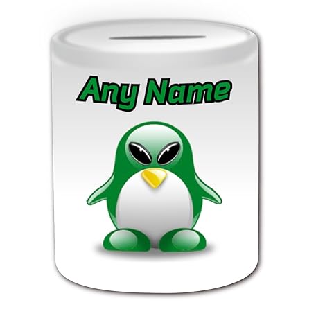 Personalised Gift - Alien Money Box (Penguin in Costume Design Theme, White) - Any Name / Message on Your Unique Saving Piggy Bank Silly Novelty UFO Extraterrestrial Space Universe Science Fiction