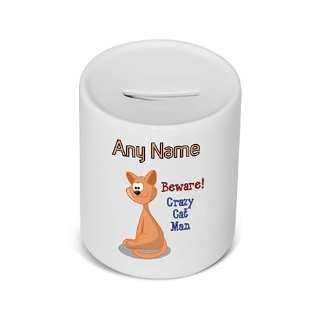 Personalised Gift - Crazy Cat Man Money Box (Animal Slogan Design White) Any Name Message Unique - Zoo Silly Cute Funny Novelty Wild Lover Kitty Kitten Pet