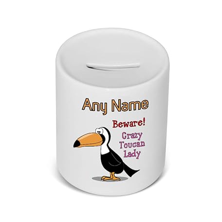 Personalised Gift - Crazy Toucan Lady Money Box (Animal Slogan Design White) Any Name Message Unique - Zoo Silly Cute Funny Novelty Wild Lover Big Beak