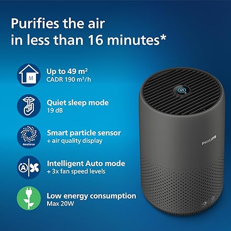 Sản phẩm Philips 800i Series Compact Air Purifier, 49m2, HEPA & Activer Carbon Filter, Removes Up To 99,5% Of The Particles & Aerosols From The Air*(1), Connected with Air+ App, Black (AC0850/31) đang được bán với giá ưu đãi là $142.2668 tại nước Anh.