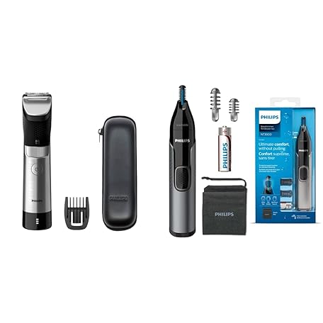 Thông tin sản phẩm Philips Beard & Trimmer for Men, 9000 Prestige, 20 Length Settings, SteelPrecision Blades, UK 3-Pin Plug- BT9810/13 & Series NT3650/16 3000 Battery-Operated Nose, Ear and Eyebrow Trimmer,Grey