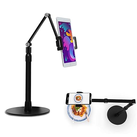 Phone Tablet Overhead Stand - Aluminum Tablet Stand Holder - Camera Mount, Adjustable Height, 360 Degree Rotation - Compatible with 3.5-11" Devices Such as iPhone/iPad/iPad Pro - 3-Angle Tilt