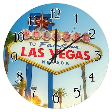 PODbyyou Wooden Wall Clock USA City Casino Las Vegas Wall Clock Silent Non-Ticking Wooden Clocks City in Nevada State Round Clock City Souvenir Clocks for Home Office 12inch