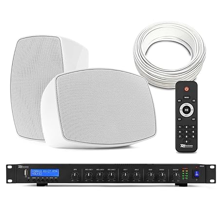 Power Dynamics Wall Mounted Speaker System with PDC90 Media Amp, Weatherproof Outdoor Speakers, Commercial Small Office or Cafe Music Sound Set, Bluetooth and DAB+ Audio