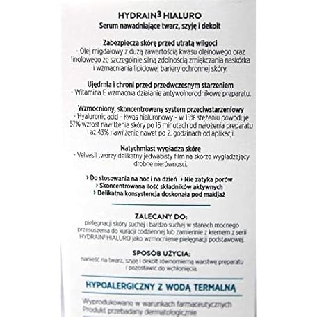 Thông tin sản phẩm PREMIUM Hyaluronic Acid Anti Ageing and Anti Wrinkle Serum For Face, Neck and Decolletage - Clinical Strength (15% HA), For day and night use. Ideal as make-up base. Hypoallergenic with Thermal Water. Dermedic Hydrain3 Hialuro