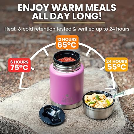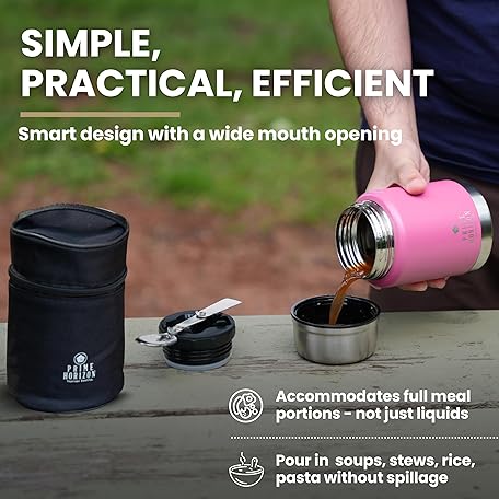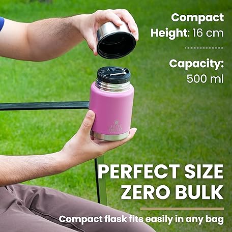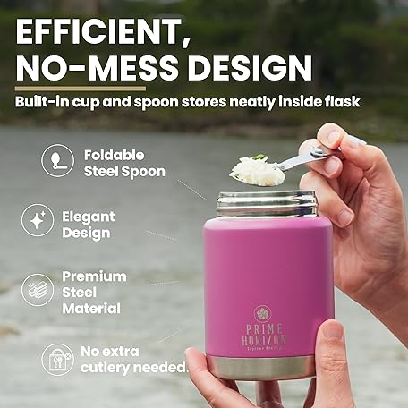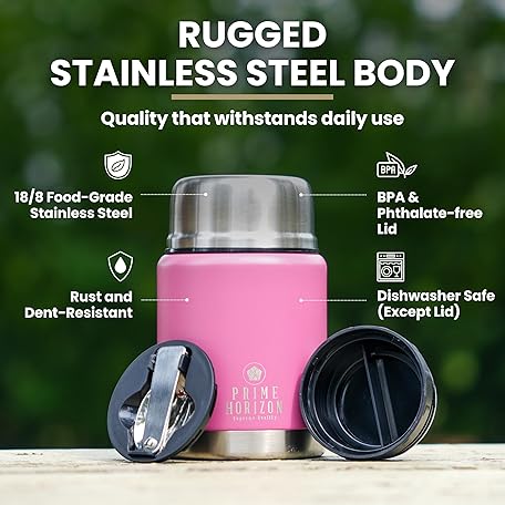 Sản phẩm Prime Horizon Food Flask - 500ml Stainless Steel Vacuum Double Wall Jar with Folding Spoon, Leakproof and BPA Free. Free Insulated Travel Bag with Carabiner and Gift Box (Pink) đang được bán với giá ưu đãi là $24.3833 tại nước Anh.