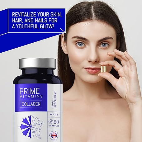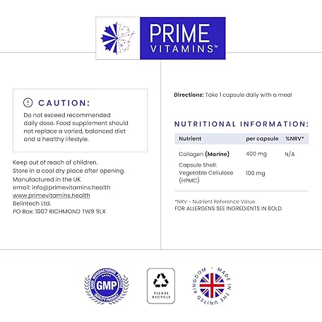 Thông tin sản phẩm PRIME VITAMINS - Marine Collagen 400mg Capsules Hydrolysed Collagen Supplements for Women & Men High Strength for Gut Health Joint Care Hair Skin and Nails, 60 Tablets, 2 Month Supply - Made in UK
