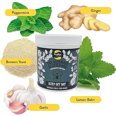 Thông tin sản phẩm Proflax Keep off Me! Flea & Tick Powder for Dogs flea treatment for dogs - Effective Flea Repellent Superfood Supplement for Dogs with All Natural Ingredients Brewers Yeast, Neem, Garlic, Ginger 450g