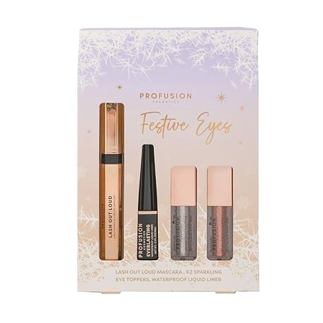 Thông tin sản phẩm Profusion Cosmetics Festive Eye Kits and Liquid Eyeshadow for Flawless Eye Catching Look, Finish Your Look With Classic Black Liquid Liner, and Lash Out Loud Lengthening With Curling Mascara
