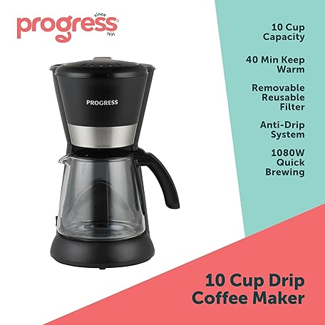 Thông tin sản phẩm PROGRESS EK6160P Filter Coffee Machine – 1.5 L Coffee Maker, 10 Cup Drip Machine, Glass Carafe, Anti-Drip, Removable Reusable Filter, 40 Minute Keep Warm Function & Auto Shut-Off, 1080 W, Black