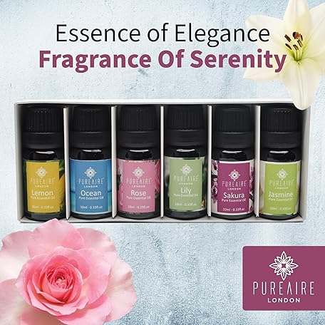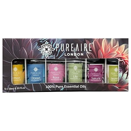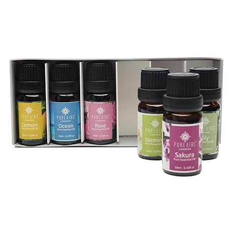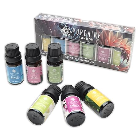 Thông tin sản phẩm PureAire Essential Oils Gift Set 6-Pack 6x10ml Aromatherapy Oils Diffuser Fragrance 100% Pure Essential for Diffusers for Home Sakura, Jasmine, Ocean, Lily, Rose & Lemon Floral Scents