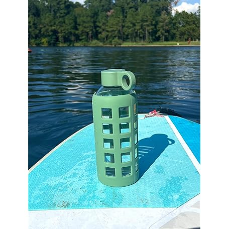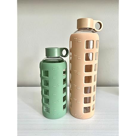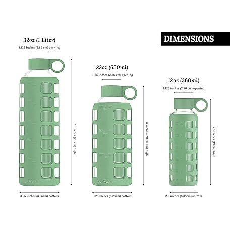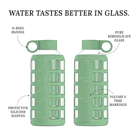 purifyou Premium 40/32 / 22/12 oz Glass Water Bottles with Volume & Times to Drink, Silicone Sleeve & Stainless Steel Lid Insert, Reusable Bottle for Fridge Water, Milk, Juice (22oz Shale Green)