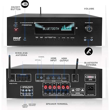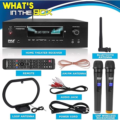 Thông tin sản phẩm Pyle Wireless BT Streaming Home Theater Receiver - 5.2-Ch Surround Sound Stereo Amplifier System w/ 4K Ultra HD Support, MP3/USB/AM/FM Radio (1000 Watt MAX), w/ 2CH UHF Wireless Microphone