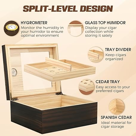 Thông tin sản phẩm QCXWCJWD Wood Cigar Humidor with Hygrometer and Divider, Handcrafted Wood Storage Box Hold 30-50 Cigars, Super Sealing Desktop Humidor Box Gift for Men