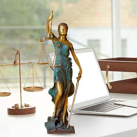 R REALONG Bronze Blind Lady Justice Statue,11" Themis Goddess of Justice- Law Figure Justice Statue Office Desk Barrister Gift. (Blue)