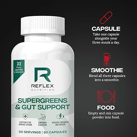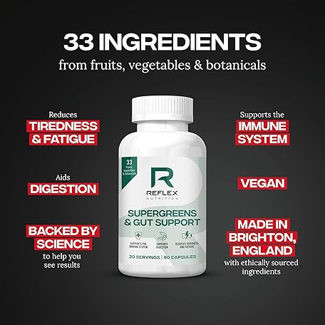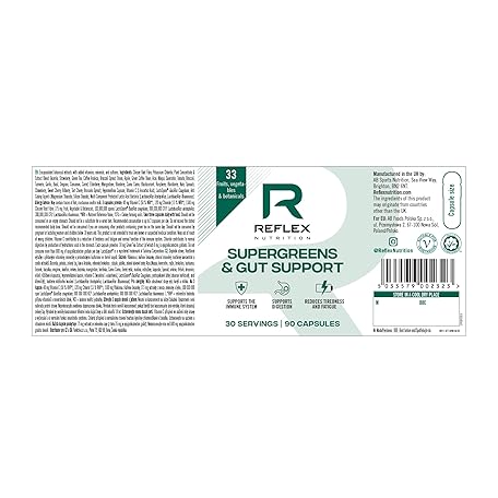 Thông tin sản phẩm Reflex Nutition Supergreens & Gut Support - 33 Active Ingredients - Prebiotics, Probiotics, Vitamins & Minerals - Immune Support, Reduce Fatigue & Bloating - Vegan Gut Health Supplement (90 Capsules)