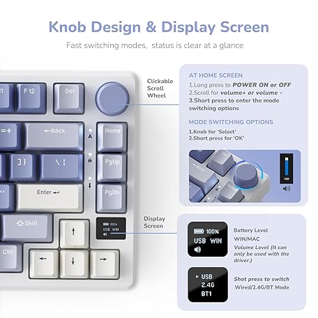 Thông tin sản phẩm RK ROYAL KLUDGE M75 Mechanical Keyboard, 2.4GHz Wireless/Bluetooth/USB-C Wired Gaming Keyboard 75% Layout 81 Keys with OLED Smart Display & Knob, RGB Backlight Hot-Swappable Red Switch, US layout