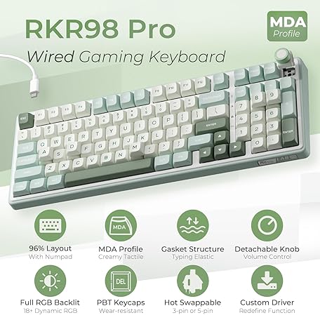 Thông tin sản phẩm RK ROYAL KLUDGE R98 Pro Gaming Keyboard, 96% Wired Mechanical Keyboard Creamy RGB with Number Pad and Volume Knob, Gasket Mount, MDA Profile US Layout PBT Keycaps, Hot Swap Pre-lubed Tactile Switch